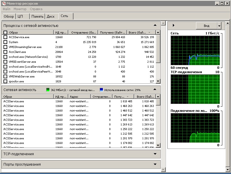 Нагрузка на сеть ~40% (400 mbit), возросшая нагрузка на ЦП и оперативку.