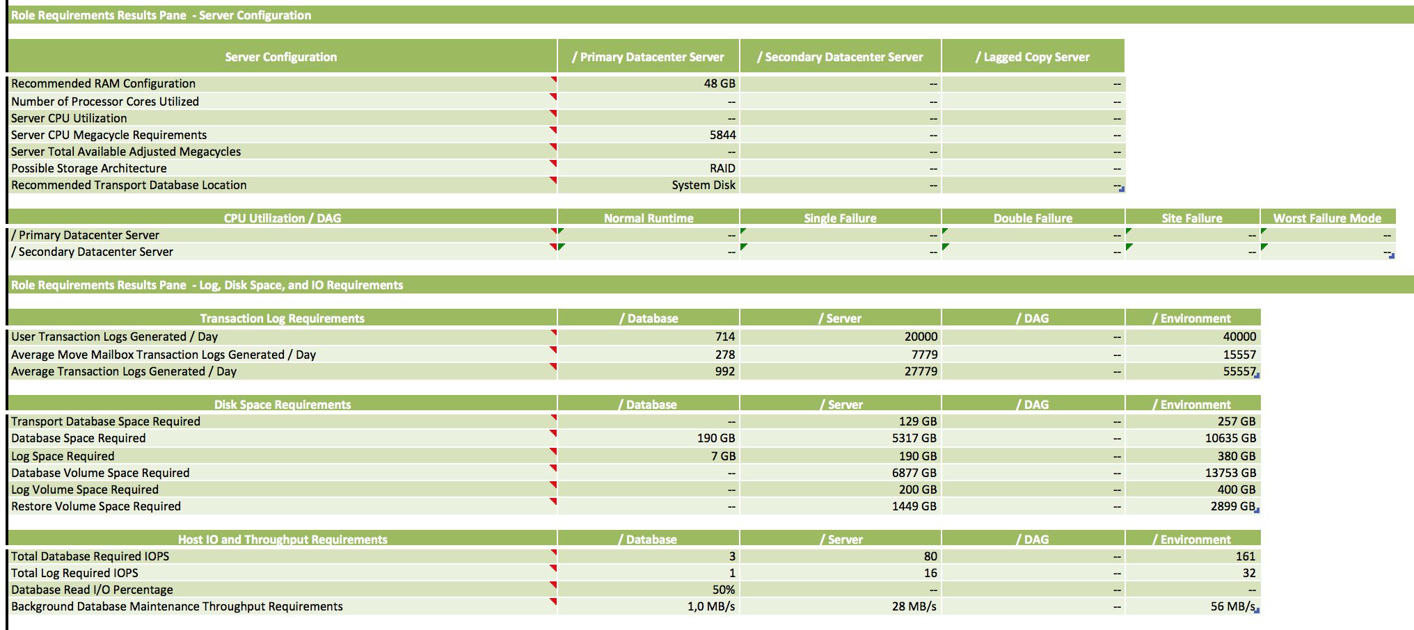 Если я правильно посчитал, то для 2013-го Ексча памяти много не надо, достаточно будет 64ГБ. А вот по дискам несколько странная картина. То ли 15ТБ, то ли все 30ТБ. Даже если допустим в кузов на 24-е диска воткнуть 24х400 Intel 3610, то получим в Р6 + хотспаре = форматированного объема где-то 7.5ТБ.