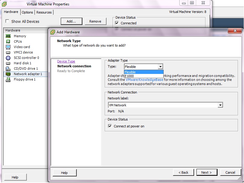 На сервер утановлен ESXi5. Железо подключено в сеть 1 Gb при установке гостевой системы Windows Server 2000 SP4 сеть в ней показывает всего 10 Mb. Вопрос в том можно ли сделать сеть 100 Mb для Server 2000? При установке самой системы устанавливается сетевая карта AMD PCNET Family PCI Ethernet Adapter, которая выдаёт всего 10 Mb. Возможность Windows Server 2000 SP4 на физическом железе, не на виртуалке 100 Mb. При утановке Windows Server 2003 на ESXi5 сеть в ней отображается в 1 Gb с сетевой картой(эмулированной в виртуалке) Intel(R) PRO/1000 MT Network Connection. Очень актуально в данном случе установка только Windows Server 2000 SP4. Тип сетевого адаптера при установке Flexible, при выборе Е1000 сеть в гостевой системе Windows Server 2000 не работает.