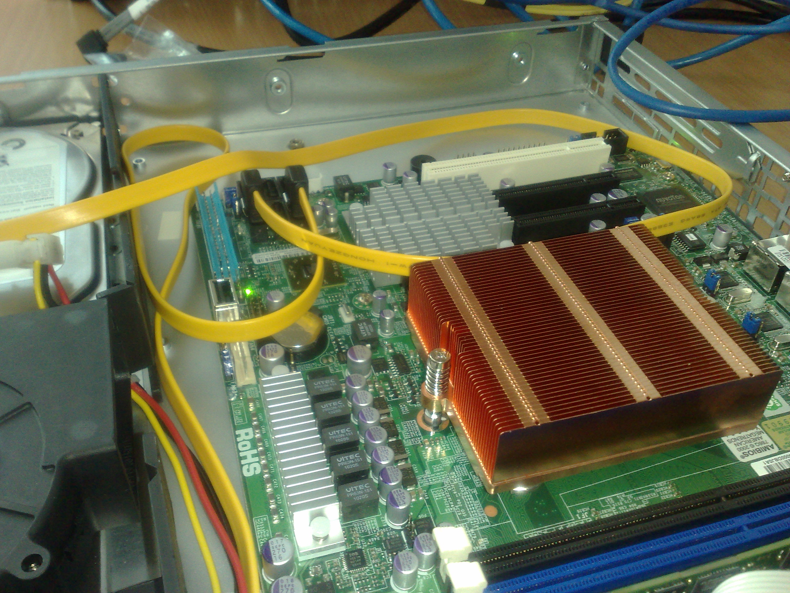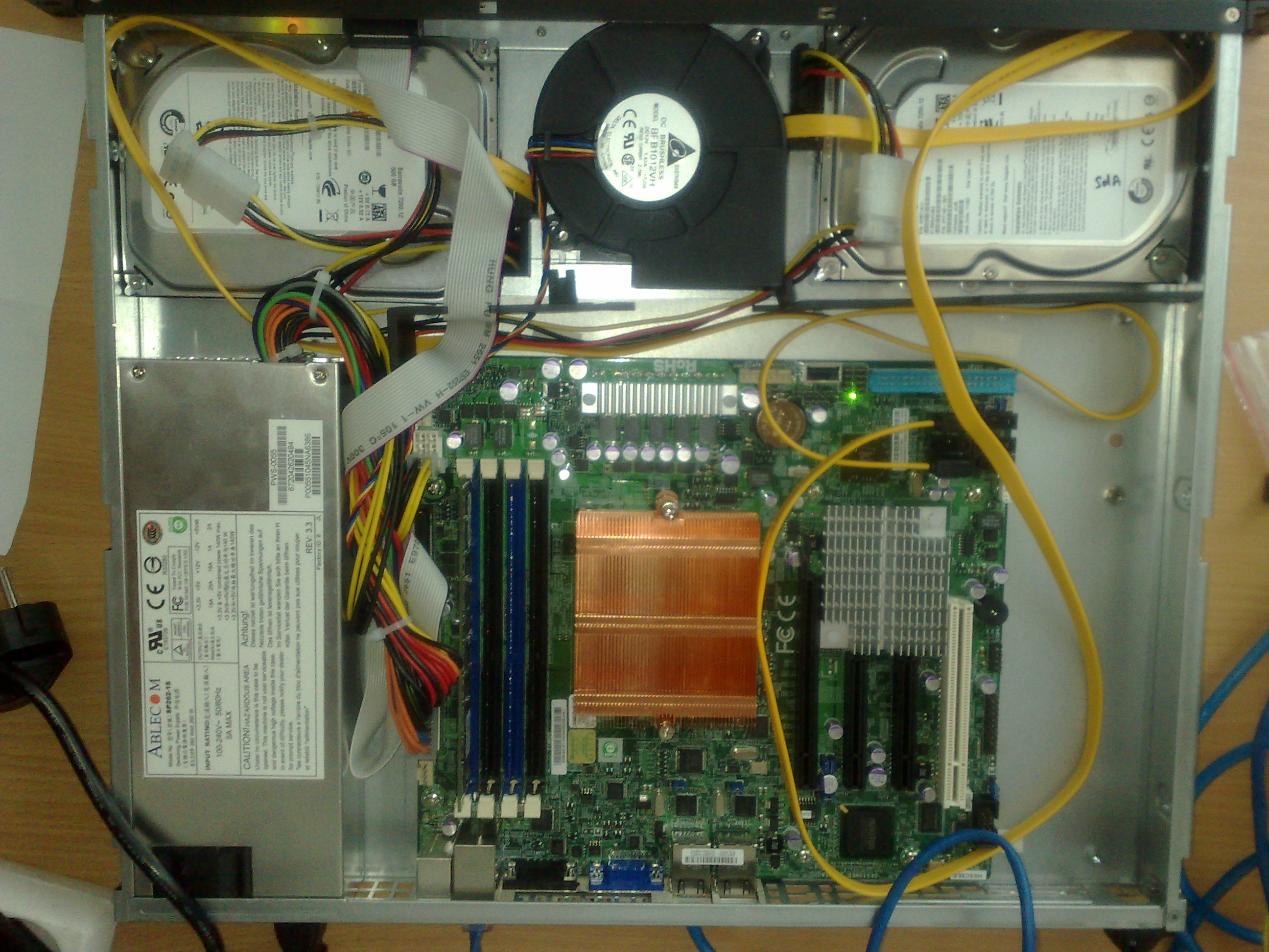 Вобщем перепробовал 6 разных пар каблей, результат такой что если диски лежат около сервера т.е. кабли относительно не перекручены то запись на SW RAID-1 ( linux, 3.0.22 vanilla ) по результатам bonnie++ (из дистрибутива, ver. 1.96 , sequential output, block) на md partition / ext3 FS даёт около 80МБ/с; тогда как внутри сервера даёт около 30МБ/с. Немогу найти источник проблемы. Фото внутренностей сервера в аттаче - посмотрите пожалуйста, может я неправильно кабеля уложил?