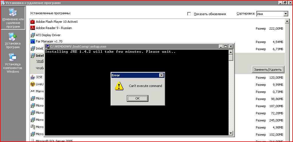 На всех Intel серверах фирмы стоит ПО мониторинга от той же Intel - Intel Server Manager 8.40. При попытке его удаления выводится сообщение об ошибке "Can't execute command" (см. скриншот) и удаление прекращается.