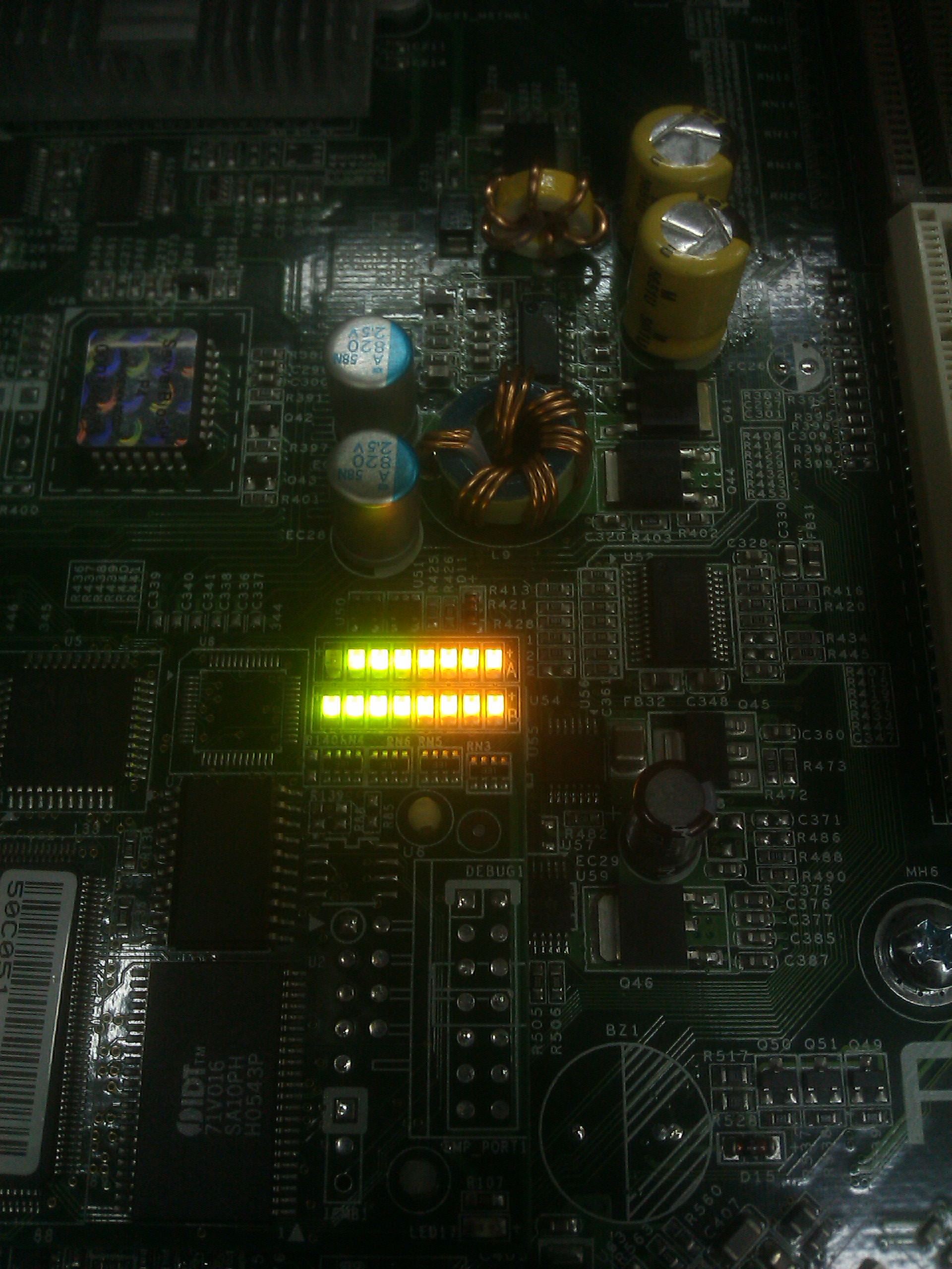 Кроме того в матплату установлен IPMI-модуль GC-IPMI15N. На нем есть 16 индикаторов (по 8 в каждом ряду. ряды обозначены A и B. в каждом ряду 4 зеленых и 4 оранжевых). Постоянно мигали 4 индикатора (3 зеленых в ряду А и один оранжевый в ряду В), после сброса ошибок этого модуля через БИОС мамы, остался мигать всего один в ряду А.