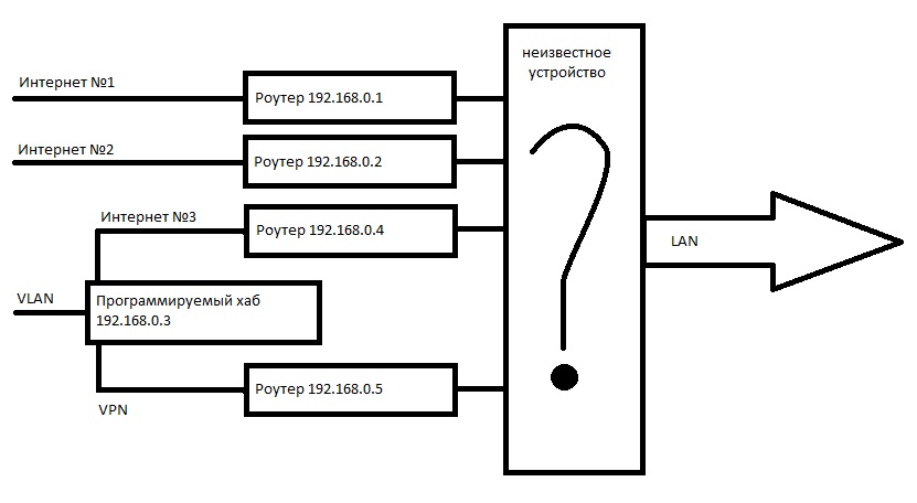 Неизвестное устройство это.... тоже роутер. На самом деле, вам хватило бы всего одного роутера, в который бы были подключены все провайдеры, он же и был бы для всех ПК шлюзом по умолчанию и занимался бы failover каналов доступа к Интернет и держал VPN (если я правильно понял часть про 172.16.1)
