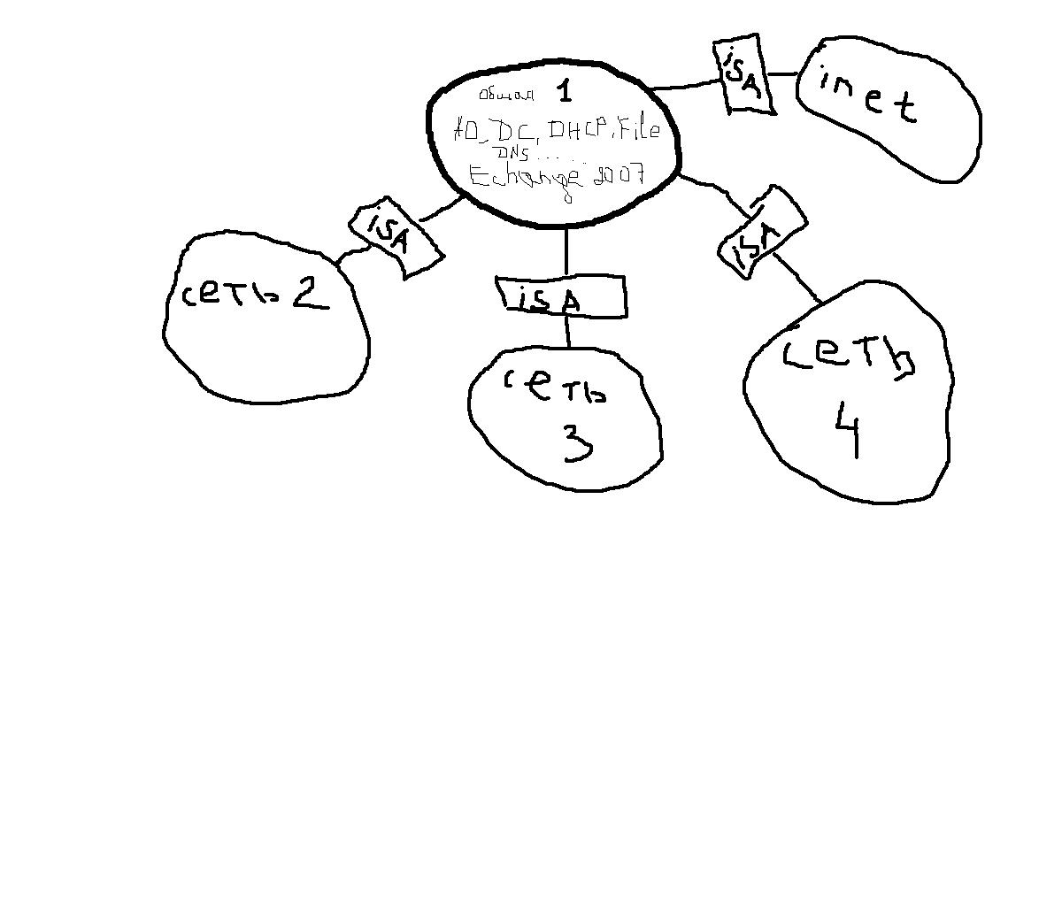 И 4 общая сеть где располагается сервера с AD, DNS, DHCP, File Servers, Date base servers, Exchange 2007, Isa 2006.