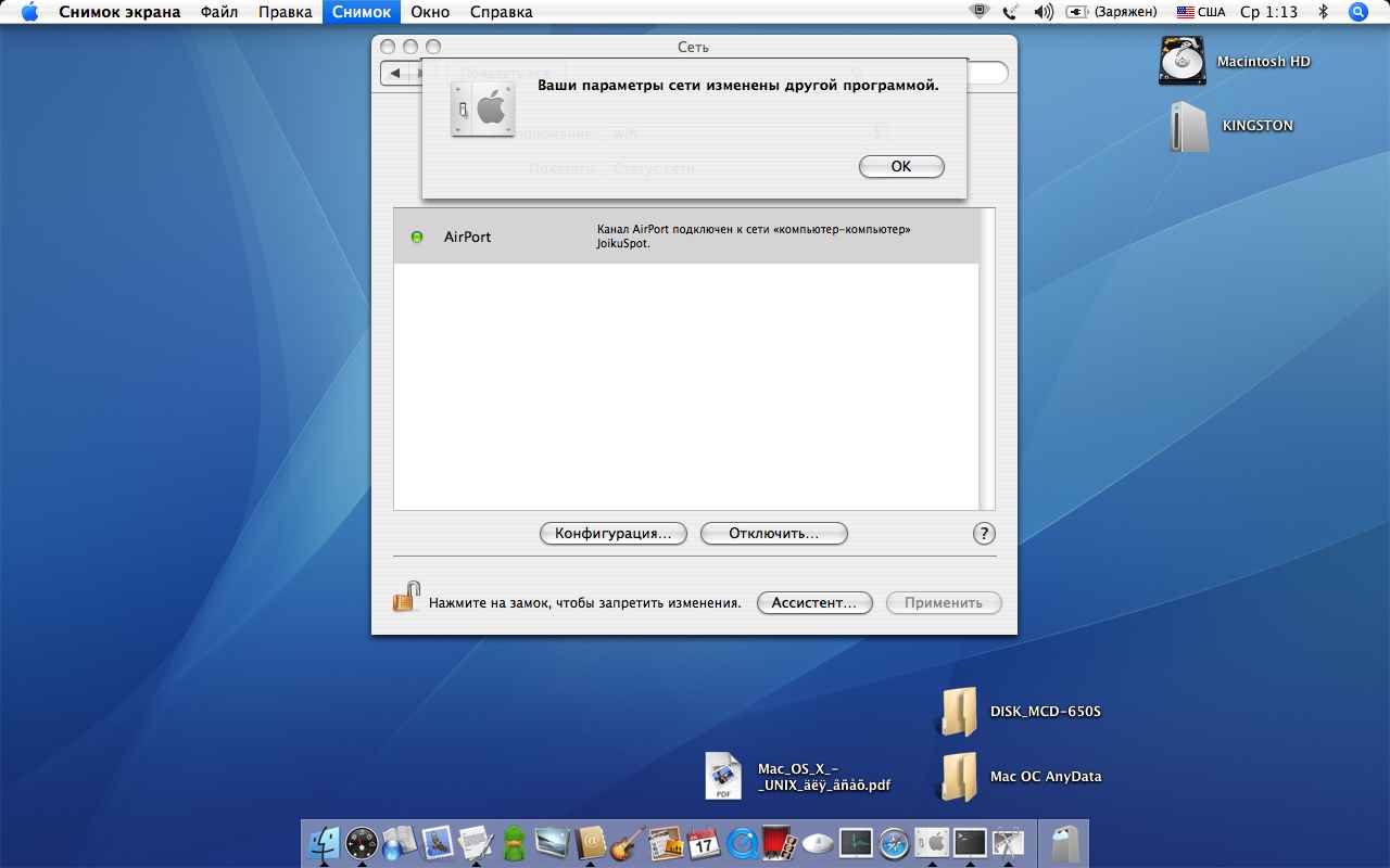 Всем привет прочитал всю веткуи и возникло много вопросов. Пользуюсь Mac OS первый день но где что искать уже разобрался. Осталось проблема в настройке сети, открываю настройки сети и вижу такое сообшение (Ваши параметры сети изменены другой программой) что почем и где искать ни как не пойму. И еше вопросик можно ли настроить Airplus MCD-650 под Maс 10.4.11
