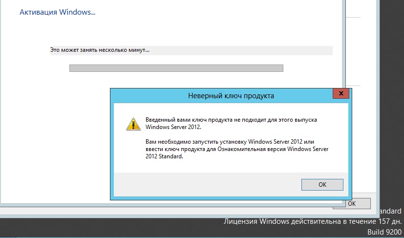 День добрый, помогите убогому :(. Столкнулся с необходимостью активации Windows Server 2012 Standard, сервер активировался пробной лицензией и теперь отказывается кушать ключик :( может кто подскажет что не так ? При установки ключ не запрашивался. Зарание Спасибо.