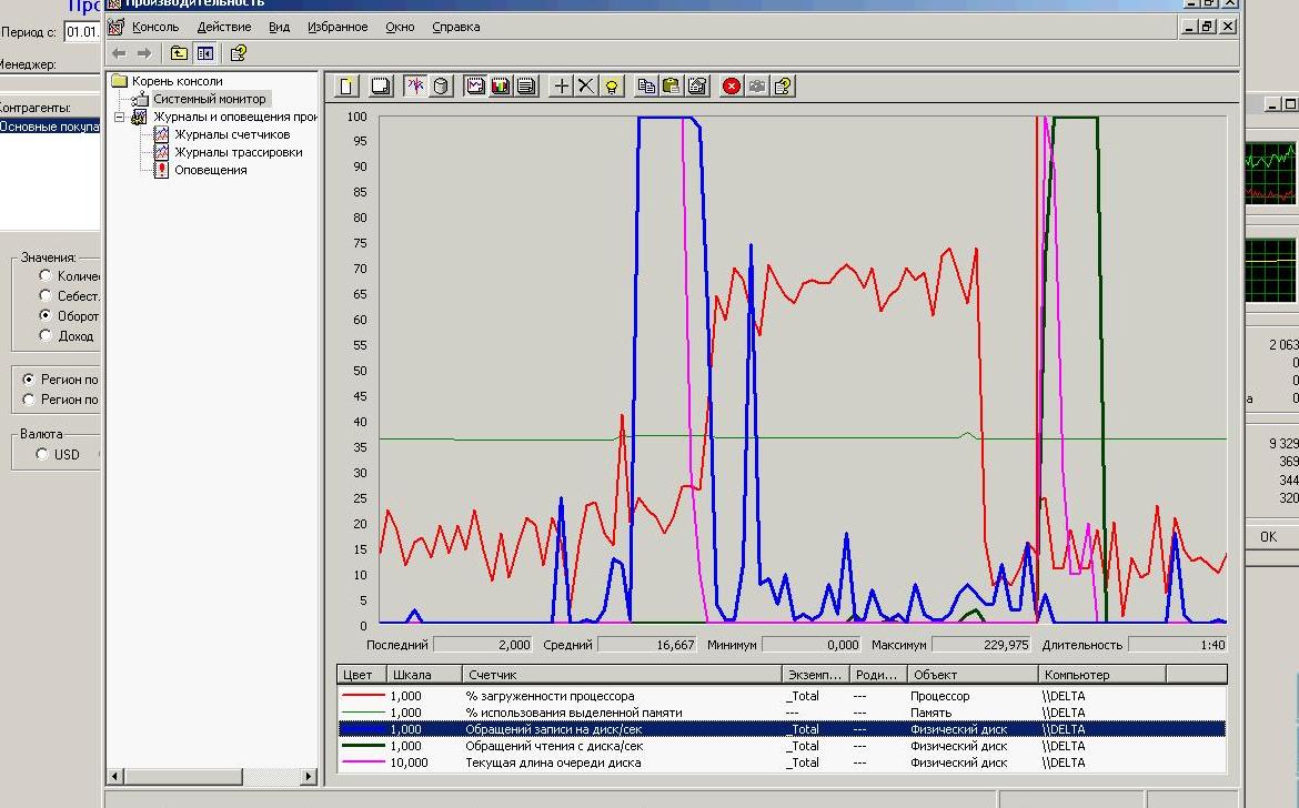 Снято под обычной нагрузкой, 35 пользователей, дополнительно формируется отчет (не на сервере, на рабочей станции)... отчет относительно длительный..минут на 15...всплеск - это стартовала обработка-робот в 1с (а вот это уже на сервере), сформировала прайс и залила по фтп на сайт.