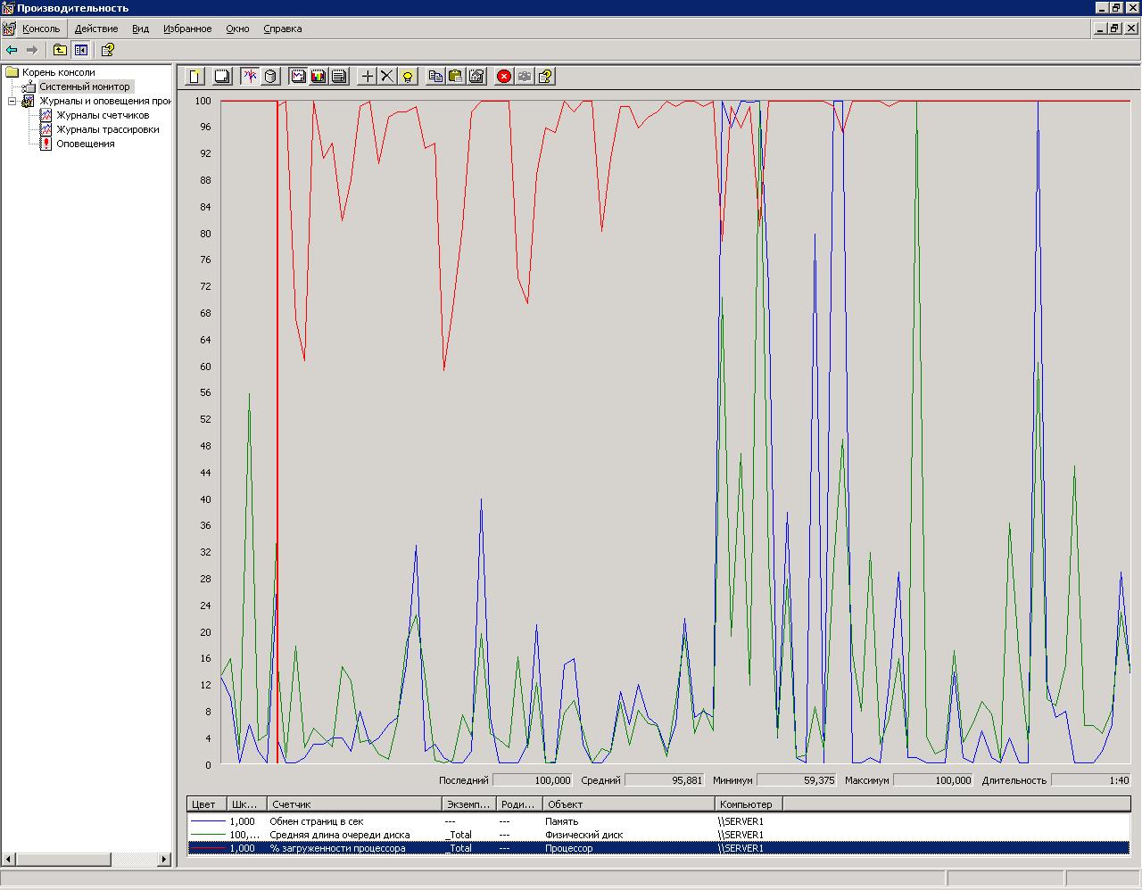 Очень высокая загрузка процессоров (кстати, процессор один или два) и дисковой системы. А если исходить из количества документов в месяц, то ясно, что пользователи работают очень активно с базами.