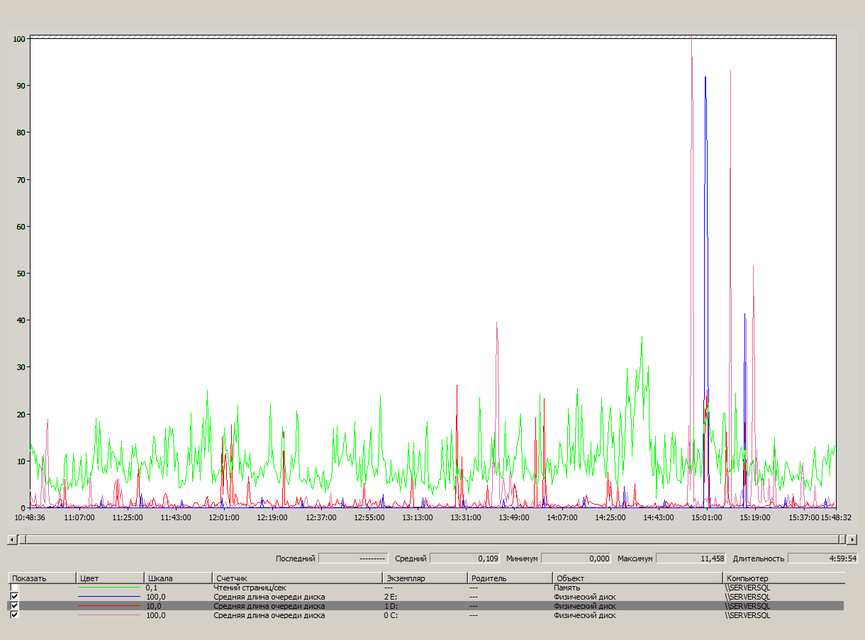 По этой же причине на диске D с базами в районе 15-00 пики на чтение