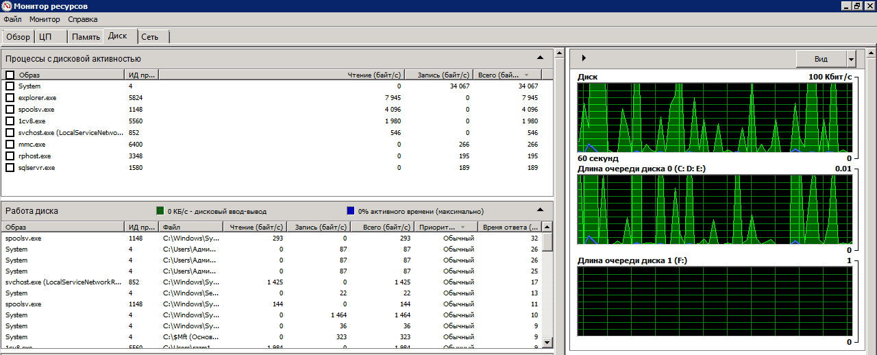 Что показывает perfmon.exe по дискам во время высокой нагрузки? Дисковая очередь, количество иопс, латенси...