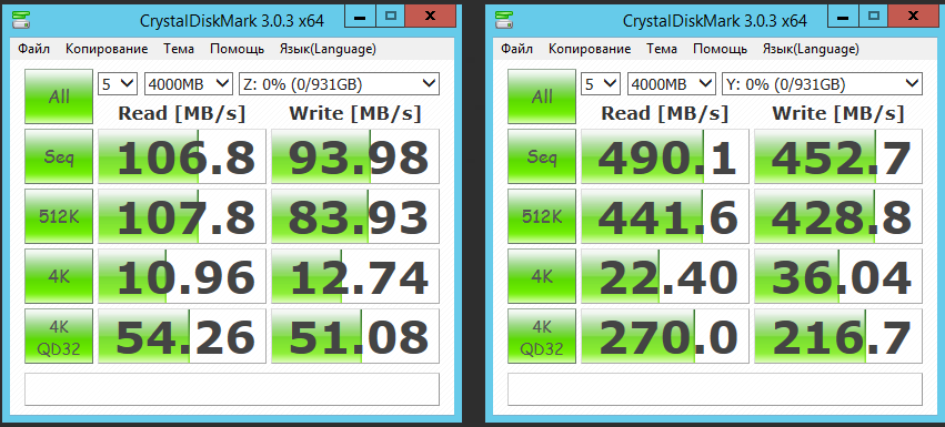 Как сконфигурирован диск? Симпл вольюм или? Оба одинаково? Какие настройки кэширования?