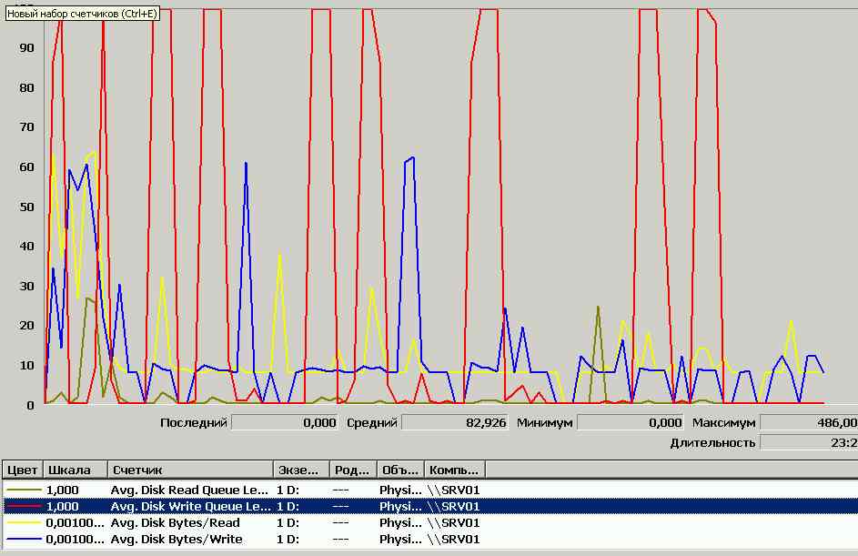 Прикладываю картинки perfmon'а по диску. Пики наблюдаются равномерно в течение активной работы пользователей.