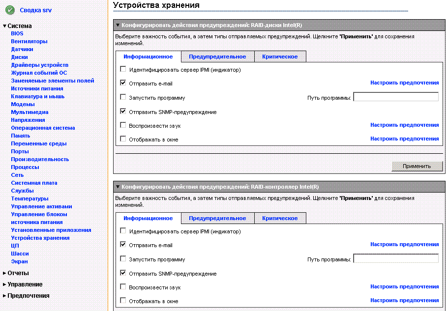Сервер уже не интел, только контроллер. Из опыта эксплуатации ISM 8.3 как-то не очень держать такого монстра на нагруженном сервере.pyramid писал(а):В этой версии веб-консоли, насколько я знаю, нет настройки алертов. Но они есть, например, в Intel Server Management 8.40. Простите, с мониторингом на Supermicro не знаком, так что может быть подсказка мимо тазика.