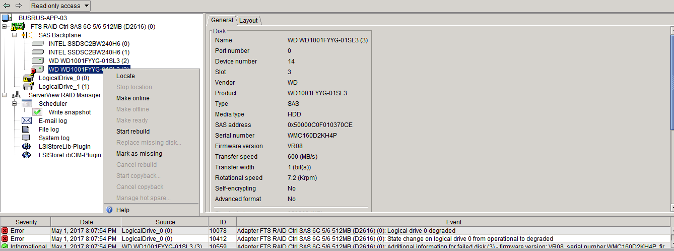 Тот же RAID-контроллер Fujitsu D2616 . На этот раз ошибка после броска напряжения на SSD диске Intel 240G SATA.