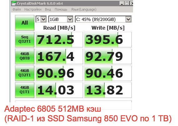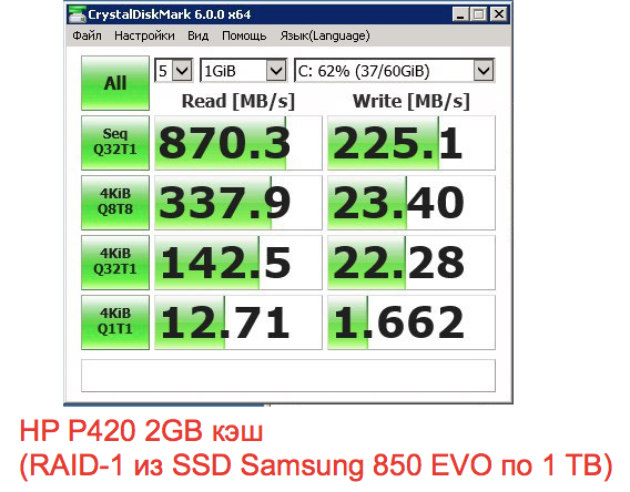 3-й вариант предпочтительный, так как можно будет использовать эти SSD на разных серверах и проще контроллировать состояние массива. Но результаты тестирования производительности с помощью CrystalDiskMark не в его пользу. Лучшие результаты на SuperMicro и Adaptec, от которых мы хотели отказываться в пользу HP DL360p Gen8.