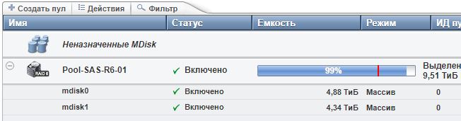Есть сабж - 24 диска по 600Gb. Создан один Pool в котором два MDisk's - 10 и 11 штук дисков в RAID-6... плюс 3 штуки "Резерв"