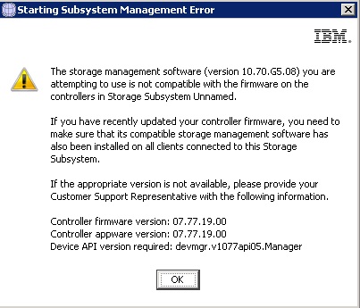 Что сделал я: подключил СХД к серверу по Ethernet от 2х контроллеров. Установил программу IBM System Storage Maneger, Произвел автоматический поиск СХД, Менеджер СХД нашел, но при попытке выполнения любых действий ругается на версию прошивки контроллера. Прошивка контроллера не обновляется штатными средствами. В интернете не нашел подобных ситуаций. Скрины с ошибками ниже. Есть предположения, что я сделал не правильно?