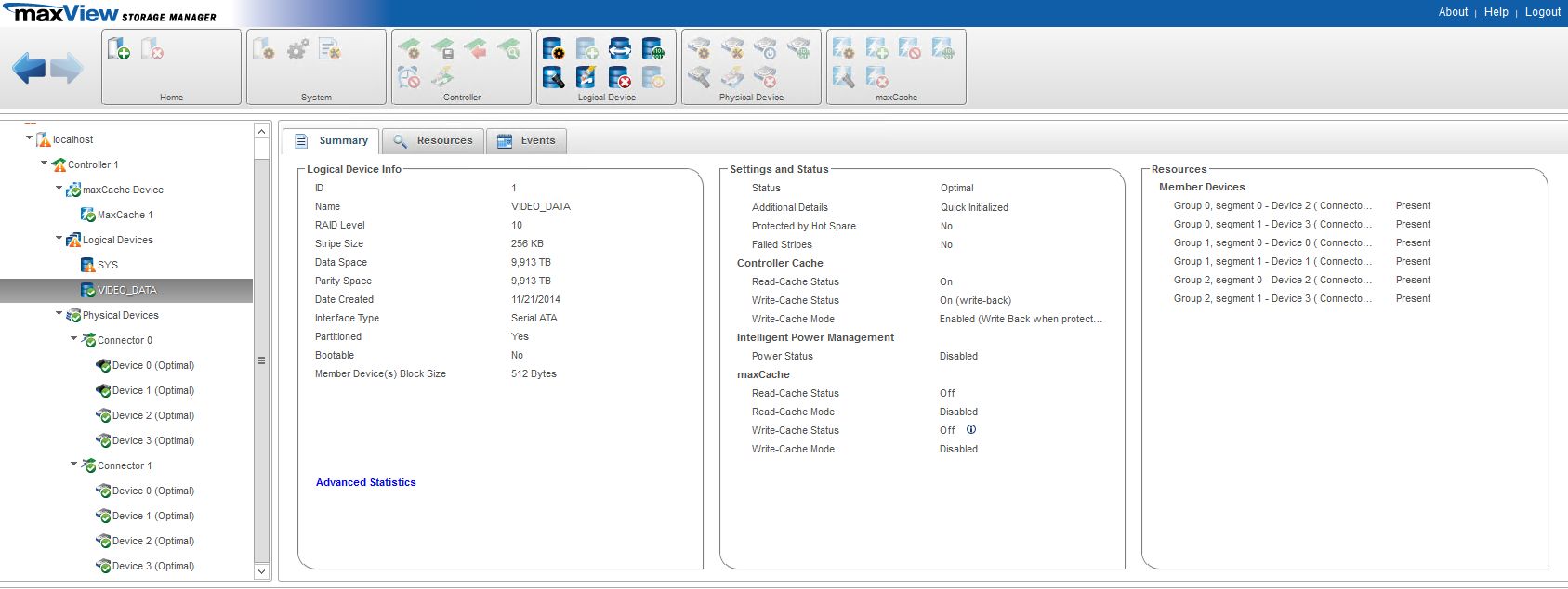 Ситуация: сервер с установленным вышеуказанным контроллером, на котором есть SSD CAche и 6 дисков SATA объемом 4 ТБ каждый, в RAID10.