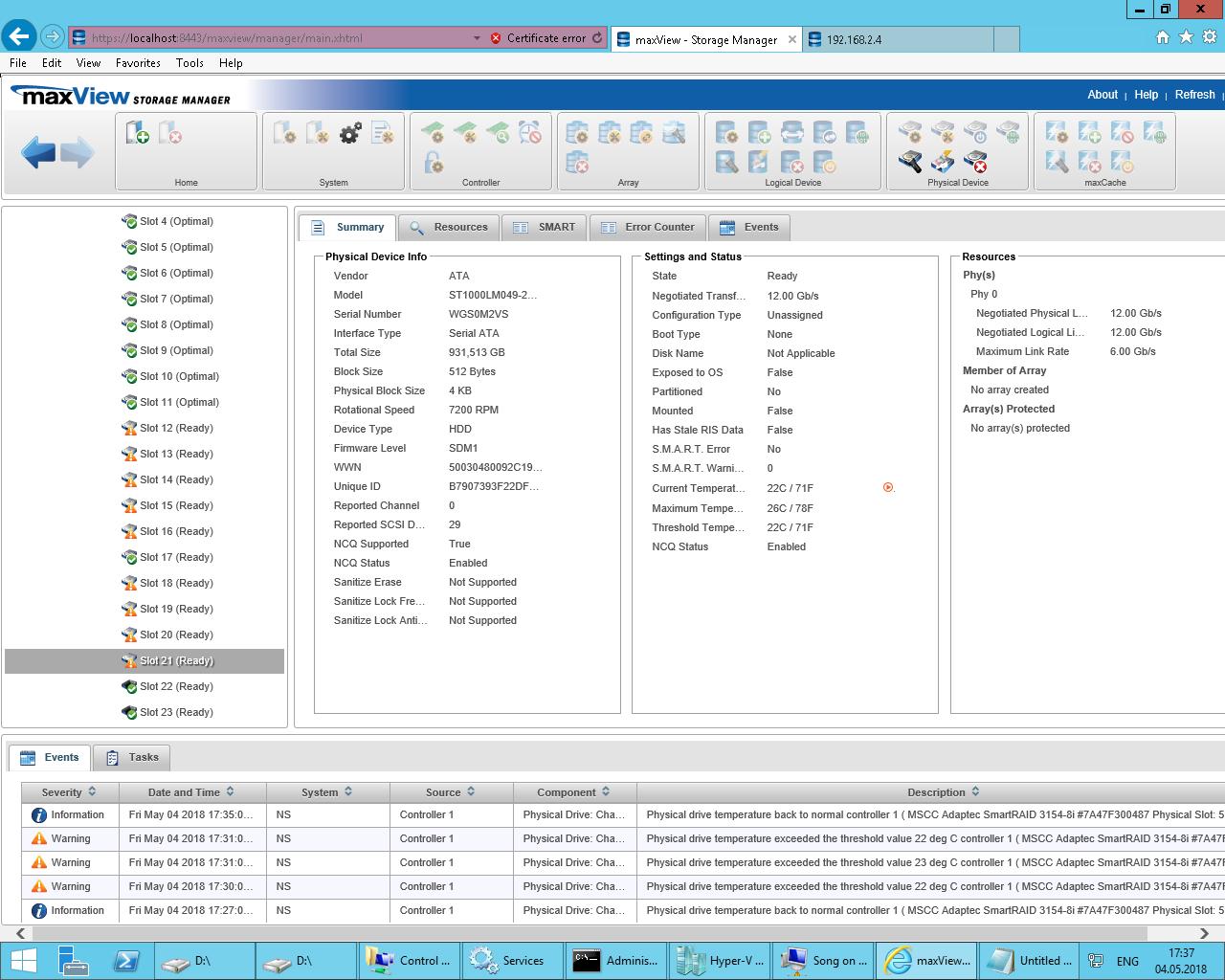 10 дисков ST1000LM049-2GH1 - вот с ними проблемы, сразу после установки в утилите MAxView появляется предупреждение , что превышена температура диска, возникает восклицательный знак и массив сформировать не удается. При этом температуры вполне допустимые