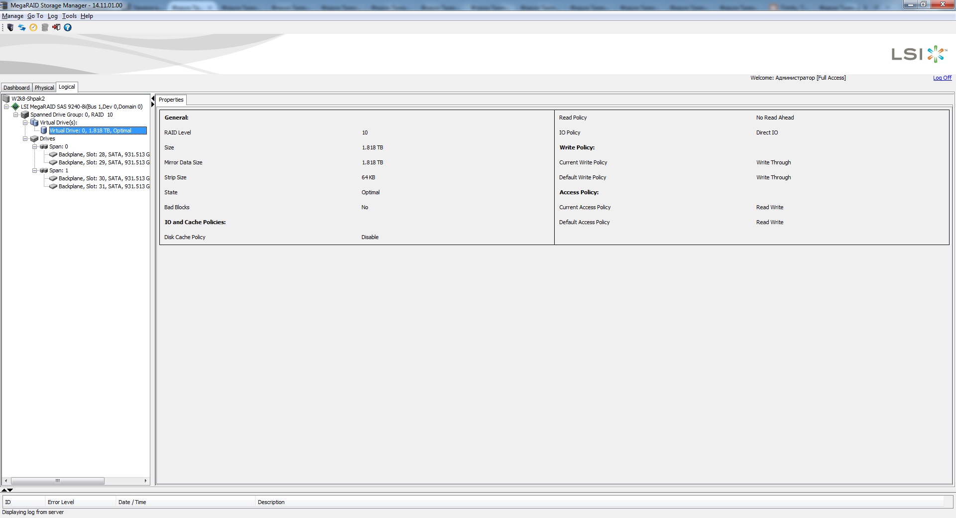 Здравствуйте! Сервер iRU ROCK 110R. 4 харда по 1 терабайту. Контроллер LSI MegaRAID SAS 9240-8i. Сделан RAID 10. В итоге один виртуальный диск на 1.8 Тб. На него установлена ОС Windows Server 2008, поставлен SQL Server 2012, в который залита БД и программа работающая с ней. По сети люди подключаются через программу к базе и работают. При работающей системе был вынут жесткий диск ID 28 (4 хардам контроллер присвоил след номера (почему-то, начиная, не с 1): 28, 29, 30, 31) из корзины и вставлен обратно через 5-10 сек.. Система и программа продолжили работать, однако контроллер выдал ошибку. Было принято решение перезагрузить систему и посмотреть в WebBIOS состояние массива. Сделав это, диск, который был вынут, стал "uncofigured bad". Загрузил систему и через "MegaRAID Storage Manager" вернул диск обратно в массив (в webbios не разобрался с ходу). Все, вроде бы система и программа заработали штатно. Но на след. день программа начала выдавать ошибки. Было принято решение обновить её, перед этим сделать бэкап и перезагрузить сервер. Однако после перезагрузки выкинуло синий экран. Восстановил систему через "Восстановление системы" (пришлось вновь подсовывать дрова контроллера, чтоб система увидела массив). В итоге пришлось переставлять и SQL Server, так как он не мог подключиться к серверу. После этого начало выдавать ошибку при попытке восстановить последнюю успешно сделанную резервную копию БД. Однако выдавало ошибки. В итоге получилось восстановить лишь ту резервную копию БД, которая была сделана до вытаскивания диска (ID 28). Отсюда есть несколько вопросов к опытным админам.