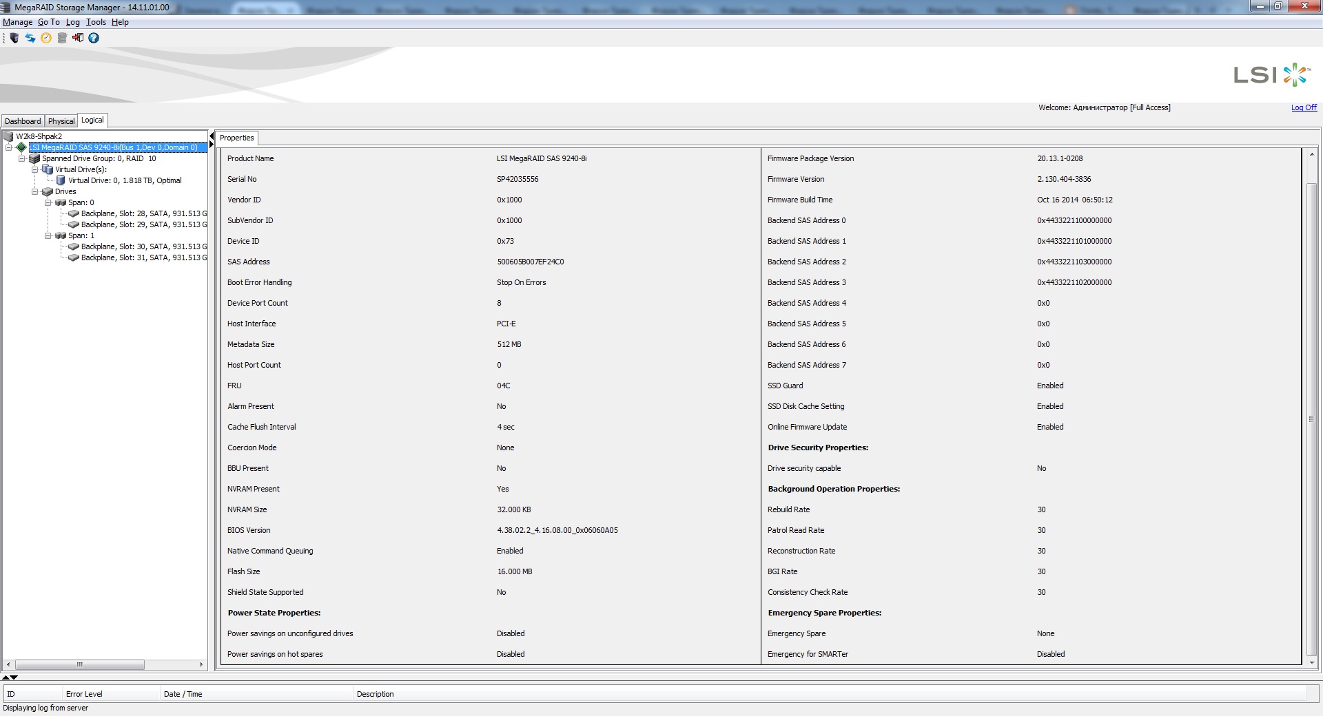 5) Какие еще есть рекомендации по настройке подобного контроллера в целях ускорения работы массива и повышения его надежности? Скрин настроек и параметров контроллера из "MegaRAID Storage Manager" прилагается.