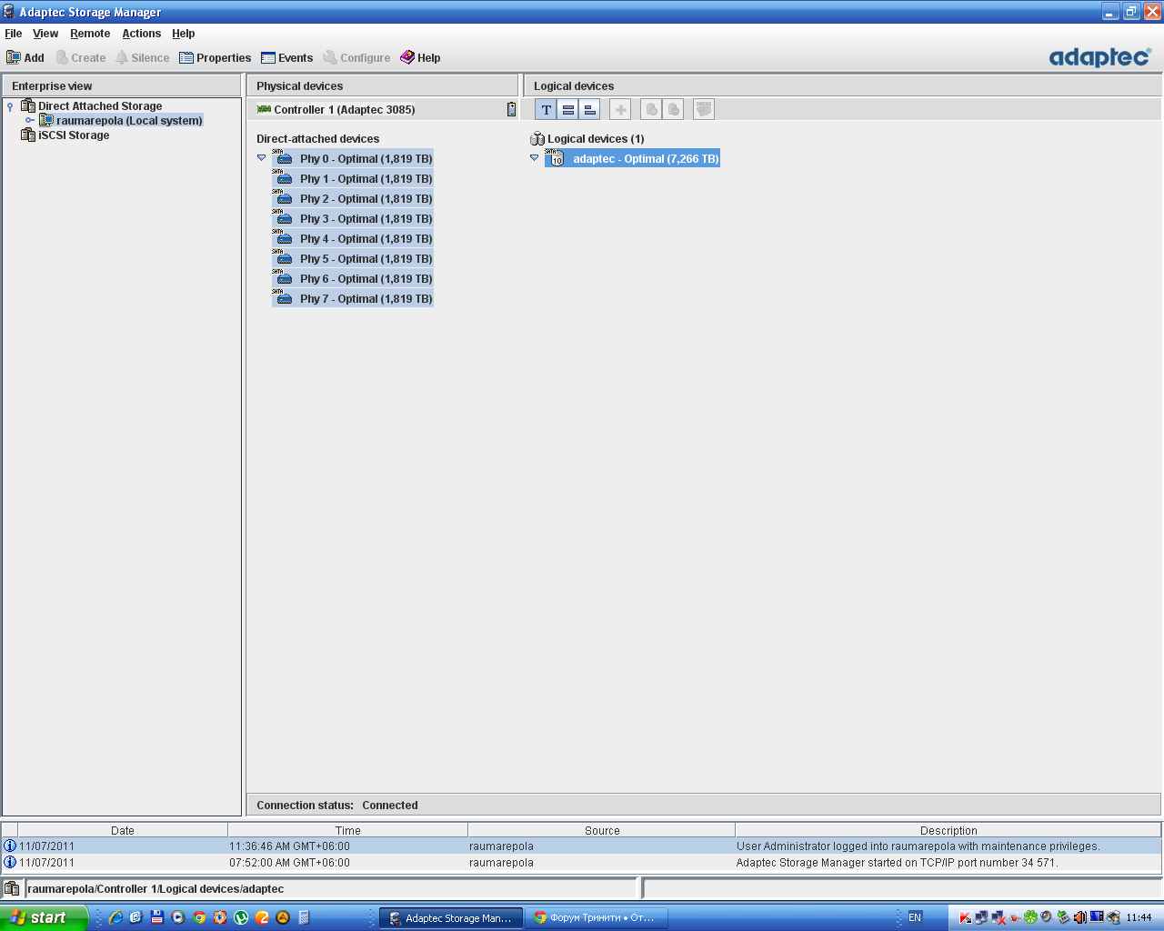 Ребят, а процент выполнения "миграции" уровня так и НЕ появился. Что я опять не так делаю? Винда видит прежний диск на 7,2 Тб, контроллер в процессе перестройки (чтение с массива 2-3 Мб) показывает 9 Тб. После перезагрузки компа массив не "упал".