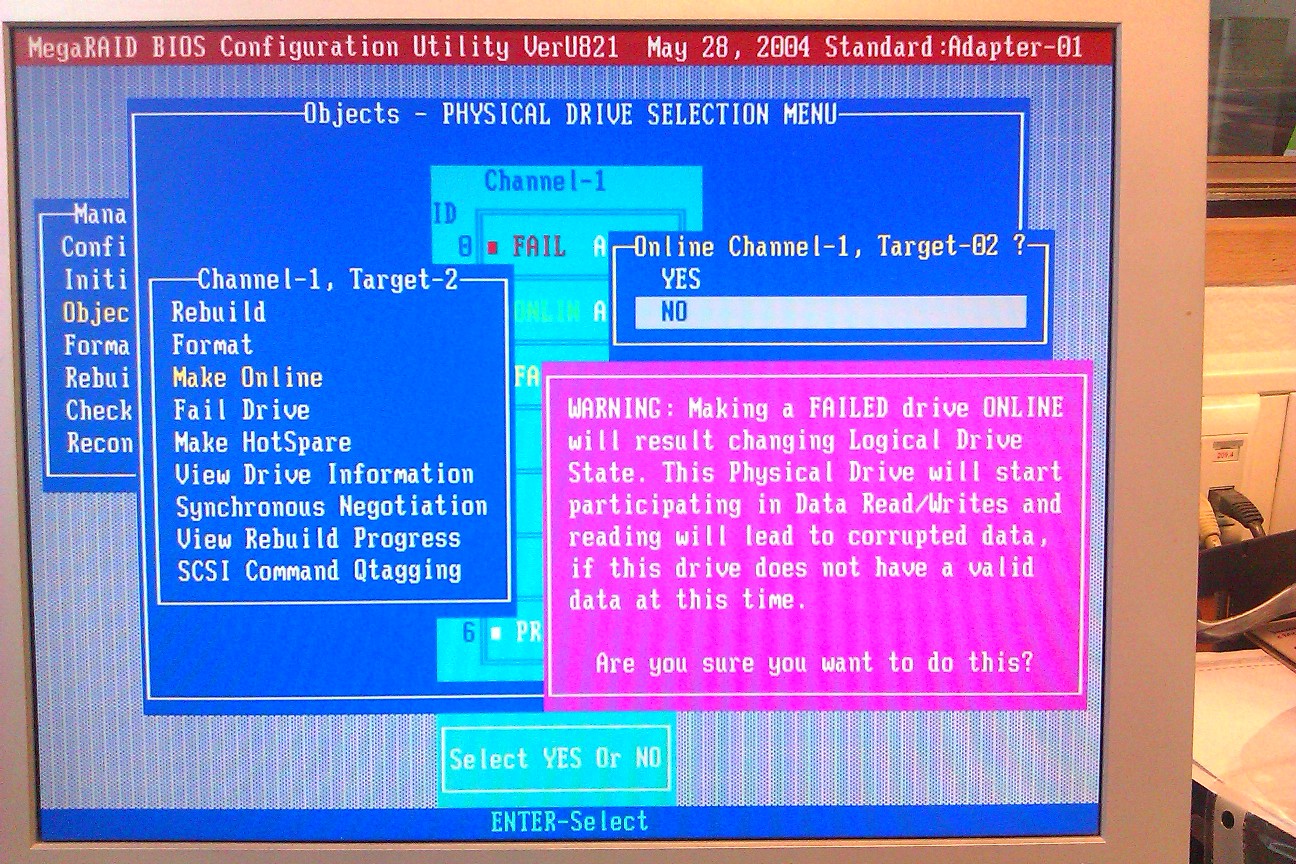 компьютер корректно завершил работу. отличили/подключили RAID и больше он не включился. я к тому что данные не обновлялись и можно смело нажимать MAKE ONLINE ? да? у меня просто появилась слабая надежда что он с себя винду загрузит после этого...))))Fader писал(а):Это если один из дисков значительно раньше вышел из строя.