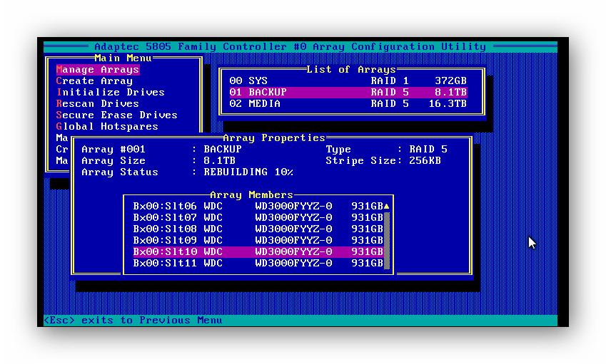 Раз в полгода-год контроллер выплевывает один произвольный винт (каждый раз винты разные) и запускает rebuild только если перезагрузиться и войти в BIOS контроллера. Иногда приходится выбрав массив Ctrl+R нажать чтобы принудительно запустить rebuild. Через виндовую утилиту сделать это невозможно, все пункты неактивны.