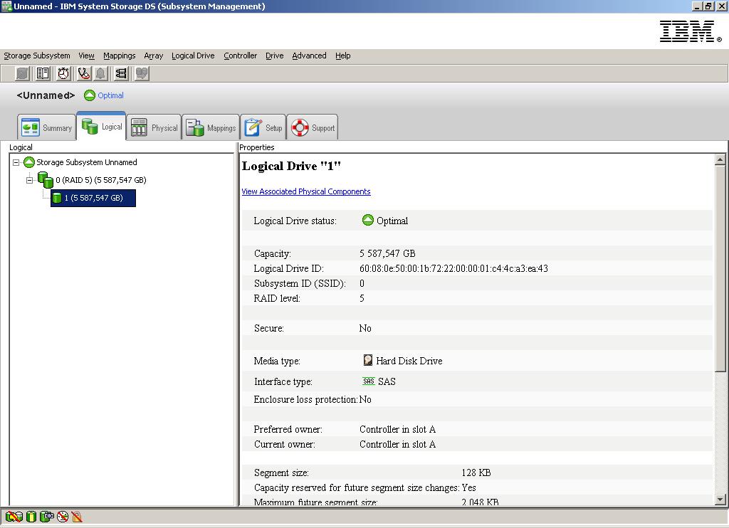 DS Storage Manager успешно обнаружил DS3512, затем я создал массив RAID-5 из всех доступных HDD. Создал один logical drive - во всю ширину массиваю Так что LUN однозначно один.