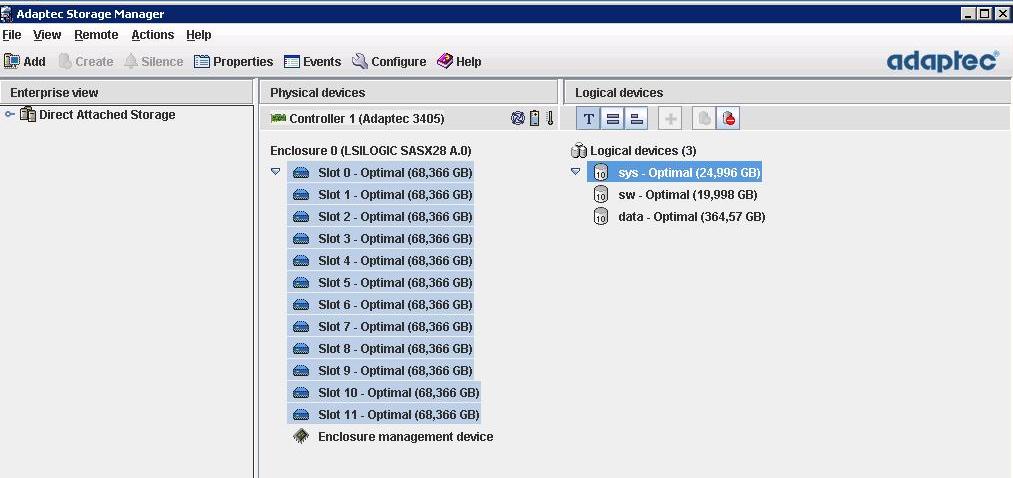 Во всех лунах по 12 дисков raid10. Только что, еще раз через Adaptec Storage Manager посмотрел состояние дисков и всего массива. Все нормально. Кеш включен, батарейка присутствует.