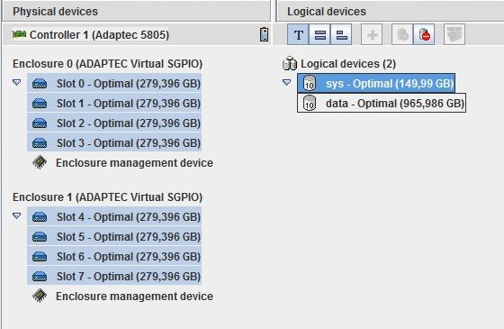 Обе приведенные выше картинки относятся к Adaptec-у. Та, что с желтым warning-ом - это диск 1, без warninga - диск 0. Возникает вопрос - почему они разные?
