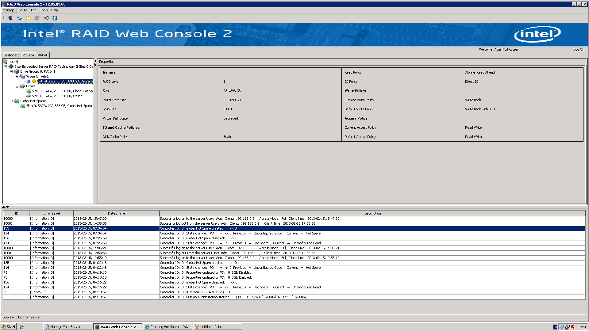 Ситуация: после очередной перезагрузки сервер на базе мат. платы Intel® Server Board S5000PSL с встроенным RAID ESRT2 дал сбой, (диск просто отпал без какого-либо статуса Failed, с ним одним в RAID-е система виснет при загрузке BIOS), система зависала на проверке RAIDа в BIOS при загрузке, пару раз дошло до появления диска на канале 1, сделал вывод, что сбойнул диск на канале 0, заменив его на рабочий, в BIOS RAID-а появилось состояние Offline, защел в BIOS Ctrl+E, диск на канале 1 - Online в массиве, на канале 0 - Ready, авторебилда почему-то не произошло, поставил диск на канале -0 в Hot Spare, после презагрузки состояние RAID - Degraded, но уже смогла загрузиться система WinServer2003, до этого не грузилась. Теперь не могу закинуть рабочий свободный диск в массив и сделать Rebuild, нет такой опции.