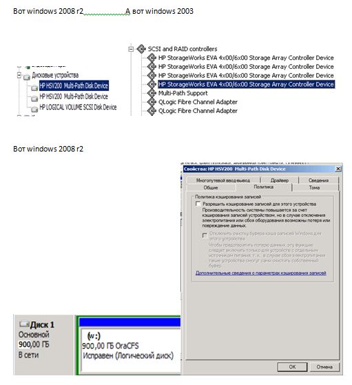 в diskmgmt-> оборудование-> были видны как hp hsv2000 scsi disk drives, так и hp hsv200 multipath disk device,