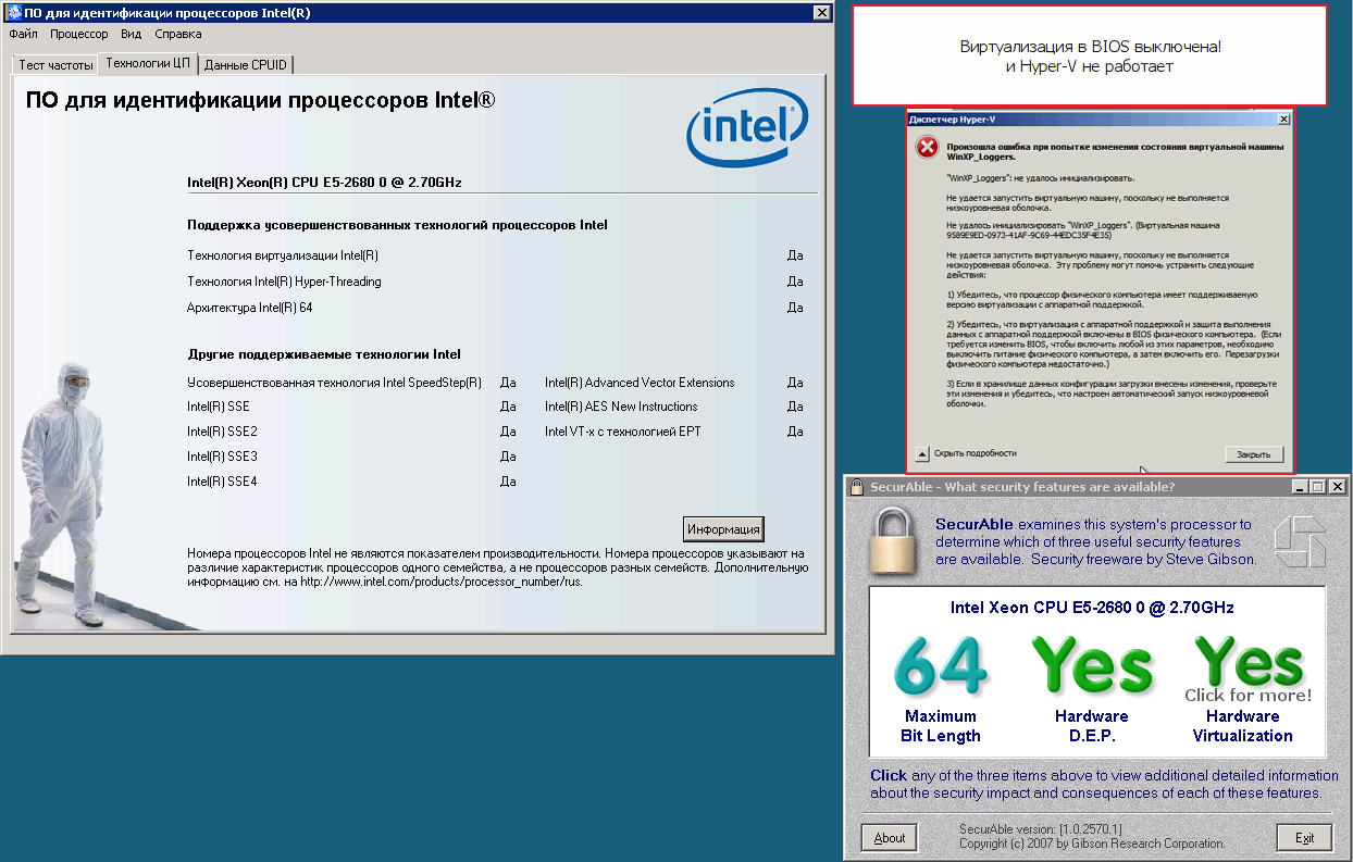 Да еще что обнаружил. ВЫКЛЮЧИВ виртуализацию securable показывает в пункте виртуализации YES, и примечание, что виртуализации обнаружена, но ее нужно включить в биосе, включаю - показывает NO.