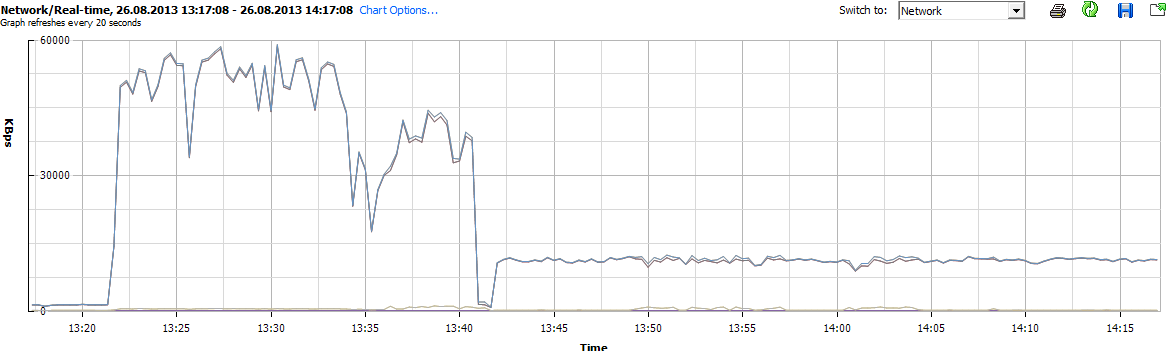 Оба сервера подключены к гигабитному свичу, и на обоих серверах стоит ESX. Я копирую ВМ с RAID-5 на Volume и вижу такую картину: сначала, в течение 20-ти минут идет на скорости 50MB/s, а потом перманентно на скорости не более 12MB/s.