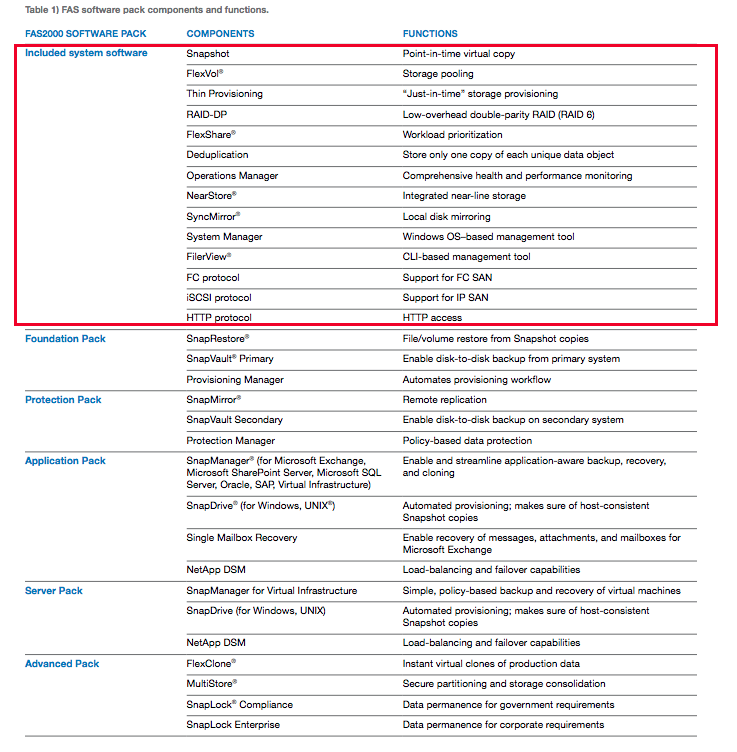 В FAS2000 Software Packs говорят, что лицензии, которые включены в девайс по умолчанию это: