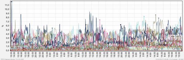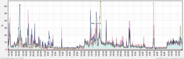 Судя по системе мониторинга, виртуалка с сервером БД и сервером 1С периодически потребляет до 90% CPU: