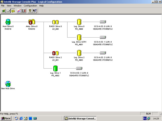 Здравствуйте уважаемые знатоки! Проблема - на контроллере Intel SRCZCR вылетел диск из 10-го рэйда (ST336607LC). Я как умный мальчик заказал новый, но "таких" новых не было, пришлось заказть ST336807LC (думаю, что ничего страшного, должен подойти). Вырубил сервак, вставил новый винт, загрузил винду - тишина... Ребилдом и не пахнет. Перезагружаюсь, захожу в меню рэйд контроллера (о боже! почему я не изучал английский