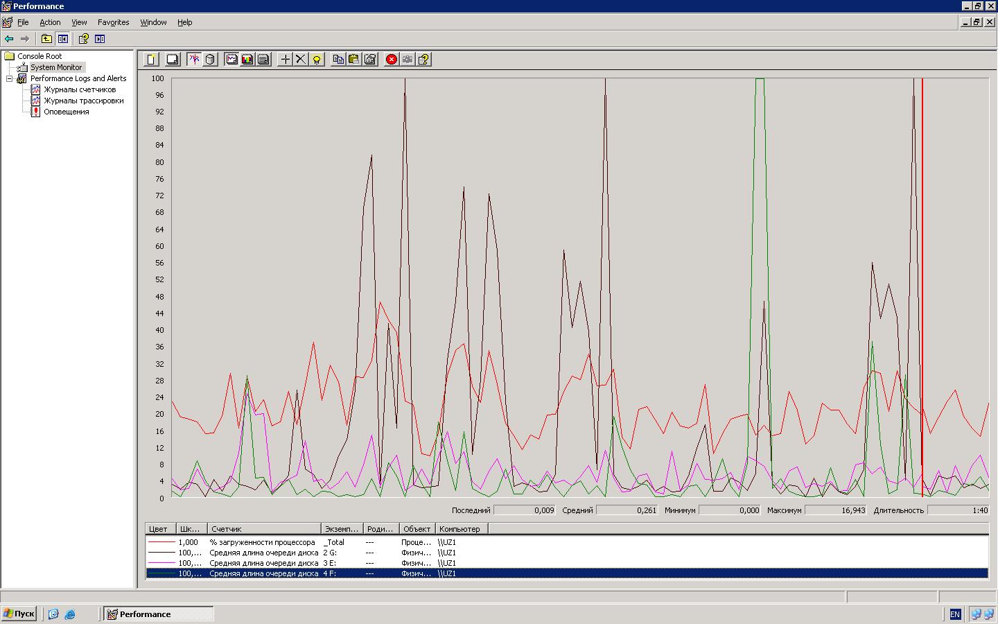 Снято под обычной нагрузкой, 35 пользователей, дополнительно формируется отчет (не на сервере, на рабочей станции)... отчет относительно длительный..минут на 15...всплеск - это стартовала обработка-робот в 1с (а вот это уже на сервере), сформировала прайс и залила по фтп на сайт.