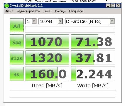4Кб блок - чтение 160Мб\с запись 2,2Мб\с