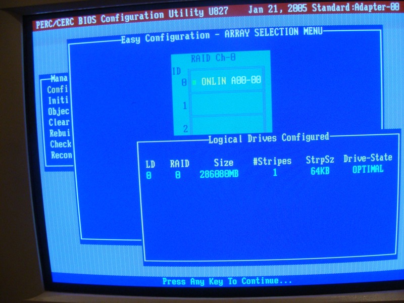 "Поковырялся" в настройках рэйда после чего система работать перестала (Dell PowerEdge 1850, два жестких диска со скази разъемами, прежде рабоавшие тут админы говорят - было зеркалирование).