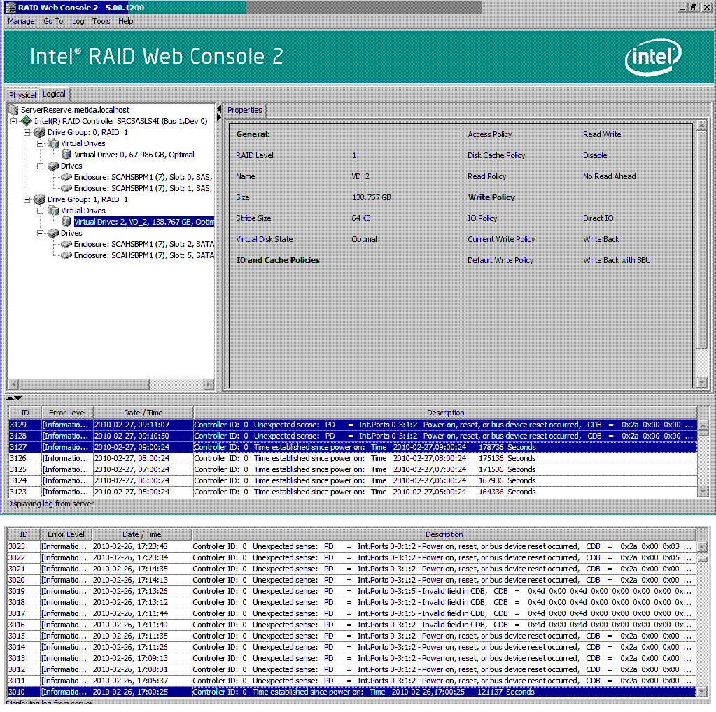 В один прекрасный момент отвалился диск в 4-том слоте. Сделали ребилд, продержался несколько дней и отвалился снова. Взяли переставили его в слот № 2, сделали ребилд, 3 дня полёт нормальный, но! как только начинаешь к примеру копировать большой файл на диск этого массива - появляются ошибки в журнале Intel RAID WEB Console 2, массив продолжает работать, диск пока не отваливается. Ошибки в приложенной картинке
