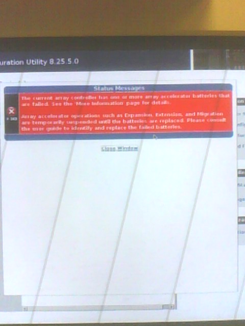 Array Accelerator Operations such as Expansions, and Migraton are temporarily suspended until the batteries are replaced. Pleasse consult the user guide to identify and replace the fail batteries.