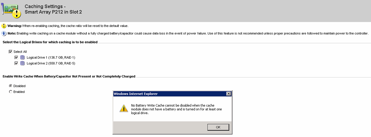 и сразу же получил предупреждение (восклицательный знак) - 347 The cache for Smart Array P212 in Slot 2 is not configured.
