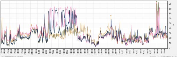 Судя по системе мониторинга, виртуалка с сервером БД и сервером 1С периодически потребляет до 90% CPU: