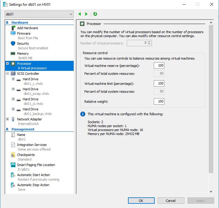 На уровне Hyper-v ему выделено столько ресурсов процессора: