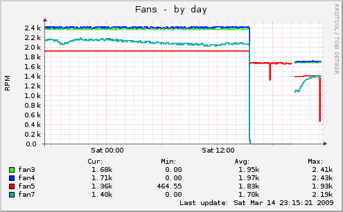 На сервере munin каждые пять минут снимает данные, в т.ч. по температуре и скорости вращения вентиляторов, и рисует графики - из них видно, что никаких скачков температуры не было. А вот с графиками скорости вентиляторов проблема. См. вложенный файл - разрыв, после которого все остальные значения, кроме fan5, вышли из нуля - это перезагрузка. Но даже после нее все скорости ниже обычного уровня! Раньше с этими графиками тоже было не все в порядке (периодически возникали "провалы"), но я списывал это на кривость lmsensors. Но загорание лампочки на корпусе с софтом явно не связано.