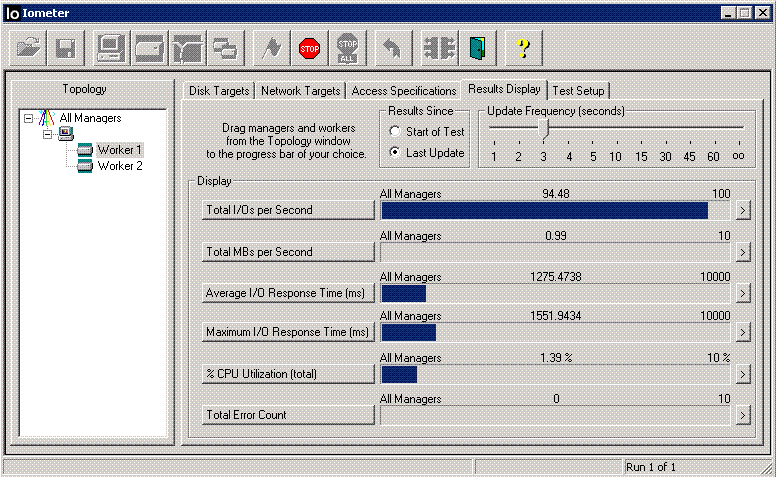 Примеры IOmeter при возникновении проблемы. размер тестового файла 2ГБ, default паттерн, 128 исх IOps: Что интересно, при настройке в исходящих IOps в 128 штук по данным счетчика производительности реально очередь на диске - 1-2 запроса...