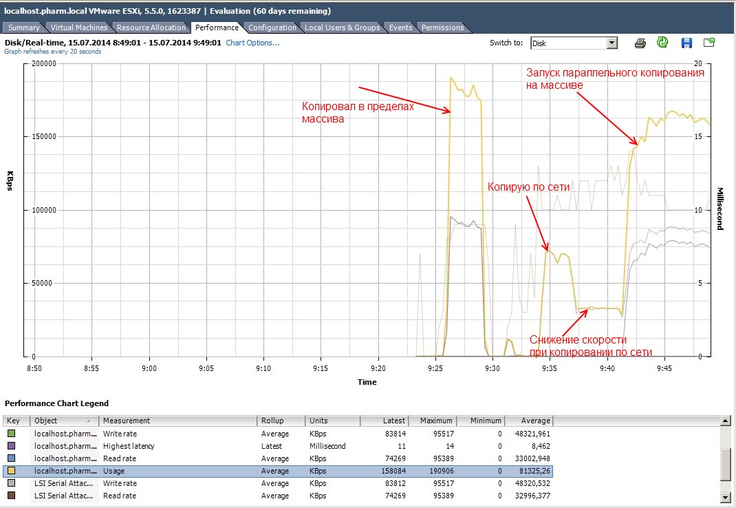Загрузил и гипервизор и понеслось... Пытаюсь скопировать на контроллер что-нибудь и в общем и целом скорость копирования колеблется в пределах 15-20 Мб/сек. Бывают всплески, но не более.