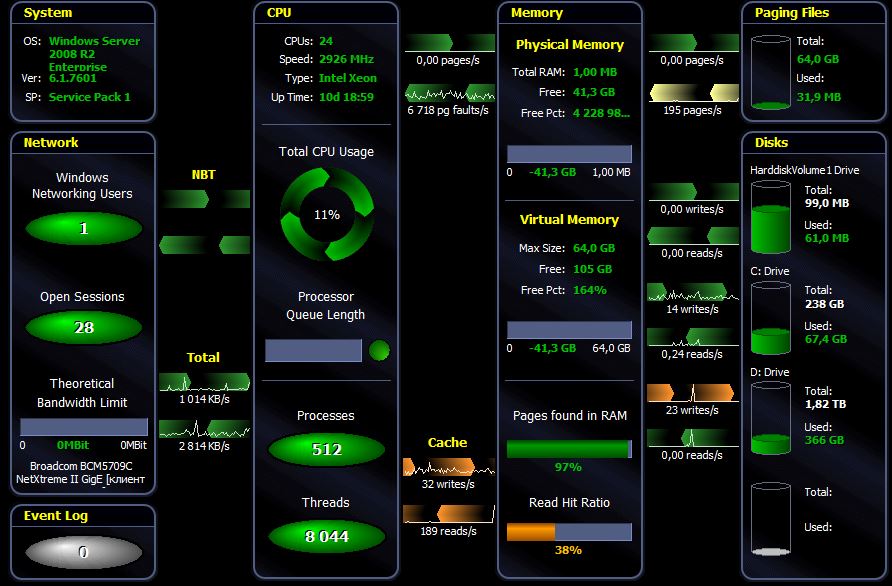 Средняя нагрузка на процессор 30-40% по ядрам тоже примерно такой же расклад, памяти съедает только 30Gb из 64. Рейд 10 сделал сам контроллер (у него просто нету выбора RAID1, только RAID10 или 5 или 6 или 0). Из профилей пользователей GPO перенаправлены только Рабочий стол, Мои документы и загрузки, все остальное осталось в прежнем месте на диске C профиль пользователя. Такие проблемы наблюдается даже если если работают только пользователей 25 из 40. т.е. что 25 что 40 задержки одинаковые. Был раньше терминальный сервер с один Xeon E5420 и 32Gb памяти (server 2008R2 std 32 разрадная) при этом система работала на одном SSD, а данные были на двух SATA Hitachi 2Tb HDS723020BLA642 и софтверном зеркале. Профили были настроены так же как и на новом. И тормоза ощущались только при количестве пользователей от 30 человек.Причем производительно дисков в разы выше на новом сервере чем на старом (разница раз в 5-10 выше)